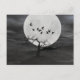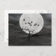 A flock of black ravens in silhouette fly over a spooky desolate landscape in front of a full moon.
