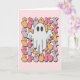 This fun and festive Halloween design features a classic ghost illustration front and center, surrounded by the word "Spooky" repeated in a bold, bubbly font. The text is layered in vibrant, retro-inspired colors like soft pinks, purples, and oranges, creating a playful contrast against the ghost's simple white figure. The ghost's expressionless black eyes add a touch of eerie charm, while the wavy, stacked typography gives the design a groovy, nostalgic feel.