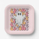 This fun and festive Halloween design features a classic ghost illustration front and center, surrounded by the word "Spooky" repeated in a bold, bubbly font. The text is layered in vibrant, retro-inspired colors like soft pinks, purples, and oranges, creating a playful contrast against the ghost's simple white figure. The ghost's expressionless black eyes add a touch of eerie charm, while the wavy, stacked typography gives the design a groovy, nostalgic feel.