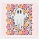 This fun and festive Halloween design features a classic ghost illustration front and center, surrounded by the word "Spooky" repeated in a bold, bubbly font. The text is layered in vibrant, retro-inspired colors like soft pinks, purples, and oranges, creating a playful contrast against the ghost's simple white figure. The ghost's expressionless black eyes add a touch of eerie charm, while the wavy, stacked typography gives the design a groovy, nostalgic feel.