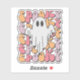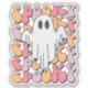 This fun and festive Halloween design features a classic ghost illustration front and center, surrounded by the word "Spooky" repeated in a bold, bubbly font. The text is layered in vibrant, retro-inspired colors like soft pinks, purples, and oranges, creating a playful contrast against the ghost's simple white figure. The ghost's expressionless black eyes add a touch of eerie charm, while the wavy, stacked typography gives the design a groovy, nostalgic feel.