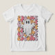 This fun and festive Halloween design features a classic ghost illustration front and center, surrounded by the word "Spooky" repeated in a bold, bubbly font. The text is layered in vibrant, retro-inspired colors like soft pinks, purples, and oranges, creating a playful contrast against the ghost's simple white figure. The ghost's expressionless black eyes add a touch of eerie charm, while the wavy, stacked typography gives the design a groovy, nostalgic feel.
