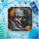 Halloween party paper plates with ai art depicting a scary clown surrounded by jack-o-lanterns.