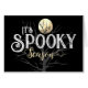 This design features the phrase "It's Spooky Season", along with the image of a bare tree and full moon. The inside of the card includes a tiled Halloween seamless pattern of iconic Halloween graphics on the inside top, and a simple greeting of "Happy Halloween" on the inside bottom. All of the fonts, and text may be customized. The seamless pattern on the inside top can be adjusted for size, but not color. The tree and moon on the front of the card may be adjusted or changed.