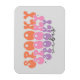 This design showcases the phrase "Spooky Spooky Spooky Vibes" arranged in a cascading, stacked format. The word "Spooky" is repeated three times, each in a different color—starting with a vibrant orange, transitioning to a soft pink, and ending with a pastel purple. The letters are thick and rounded, giving a playful and bubbly appearance that contrasts with the spooky theme. The word "vibes" is written below in a delicate, black cursive font, adding a stylish touch to the overall design. Small star accents surround the text, enhancing the whimsical and festive mood. This design is perfect for a fun and light-hearted take on Halloween.