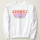 This design showcases the phrase "Spooky Spooky Spooky Vibes" arranged in a cascading, stacked format. The word "Spooky" is repeated three times, each in a different color—starting with a vibrant orange, transitioning to a soft pink, and ending with a pastel purple. The letters are thick and rounded, giving a playful and bubbly appearance that contrasts with the spooky theme. The word "vibes" is written below in a delicate, black cursive font, adding a stylish touch to the overall design. Small star accents surround the text, enhancing the whimsical and festive mood. This design is perfect for a fun and light-hearted take on Halloween.