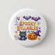 A festive Halloween-themed illustration featuring the phrase "SPOOKY SYLLABLES" in large, orange and purple gradient letters. Surrounding the text are various cartoon characters and objects: a cheerful white ghost, two hanging happy bats, an adorable black cat, a smiling jack-o'-lantern with a carved face and a purple witch hat on top, skulls, bones, and candy corn pieces. The background is dark with scattered star sparkles.
