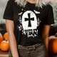 Fun 'Spooky Town' Halloween t shirt with headstone, cross, spider, skull, bats and florals. White design with slight textured grunge overlay effect. The perfect spooky shirt for Halloween parties, trick or treating, and memorable group photos.