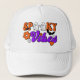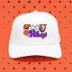 Embrace the Halloween spirit with this cute trucker hat! This hat features a retro 1970s font with the word “Spooky” creatively designed with ghost illustrations replacing the 'O’s. It's also adorned with flowers, a heart, and bats, all in classic Halloween colors of orange, black, white, and purple.