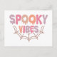 This fun and festive Halloween design features the phrase "Spooky Vibes" in a playful, dripping font that gives the text a gooey, eerie effect. The words are filled with soft, pastel shades of pink, orange, purple, and peach, adding a lighthearted and whimsical twist to the spooky theme. Beneath the text, a simple spider web illustration in a soft brown color adds a classic Halloween touch, tying the design together. The combination of the pastel colors and the spooky elements creates a unique contrast that’s both cute and a little bit creepy, making it perfect for Halloween