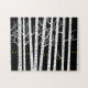 Puzzle shows a white birch tree forest and spooky, scary yellow eyes staring out between the trees on a creepy, dark, black night. There are no cute birds or deer in these woods, just monsters. Novel, funny, humorous, original take on a classic design.