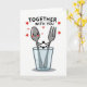 This greeting card shows a smiling spoon and an upright fork standing side by side inside a clear drinking glass, like two close companions sharing a small space. The spoon on the left has rosy cheeks and a wide grin, while the fork on the right looks steady and attentive, its prongs neatly lined up. Each one has simple, stick-like arms reaching out, and their small dark hands meet in a gentle clasp that feels like a quiet promise ❤️. Above them, the phrase “TOGETHER WITH YOU” sits near the top in dark, thick lettering that stands out against the white background. Around the text and drifting across the open space are scattered red hearts, adding a sweet, floating rhythm 🥰. The utensils are shaded in soft silver tones, and the glass has a light blue-grey tint that gives it a cool, see-through look. The background stays plain white, making the red hearts, pink cheeks, and the centered glass-and-utensils pair the main focus.
