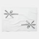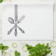 A crisp black and white kitchen towel with spoon, knife and fork.