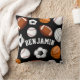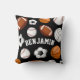 A black throw pillow featuring an assortment of sports balls and a spot for your gift recipient's name centered within them.