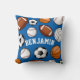 A blue throw pillow featuring an assortment of sports balls and a spot for your gift recipient's name centered within them.