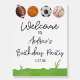 this is a sports themed birthday party welcome sign. It included a football, basketball, soccer, and baseball.