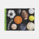 A custom black fleece blanket featuring a variety of painted style sports balls. The items include a baseball, football, volleyball, tennis balls, hockey puck, soccer ball, volleyball, bowling ball, and basketball. Towards the bottom corner is a spot for yours or your gift recipients name. The individual balls are actually removable so you can add more text to the blanket if you please. Have fun creating and making it your own.
