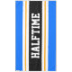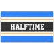 This sporty, athletic design features bold HALFTIME text inside a highlighted wide black stripe with golden yellow orange and white racing stripes against bright blue outer stripes. The text can be personalized.
