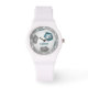This cute personalized soccer themed watch features a simple soccer ball graphic upon which you can customize the athlete's name and jersey number - the soccer ball's black panels have been recolored teal and gray - the background is customizable light gray with overlying goal net accent graphic and white clock face numerals - by katz_d_zynes