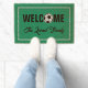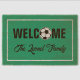 Sporty green soccer field personalized coir Fiber Doormat. Cute design for soccer fans. Add your own custom name.