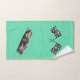 On this towel set is a race car on a green backdrop with checkered flags. Can be customized to make it uniquely your own.