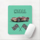 A sporty race car with a green backdrop and checkered race flags below and on top an area where you can personalize it to make it uniquely your own. Boyish fast car vibes.