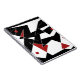 Various white and red geometric shapes are scattered across a black background, creating a stark contrast. Some shapes are interconnected with thin white lines, and red dots add a pop of color to the composition.