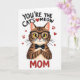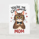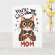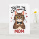 This card features an upright, human-like tabby cat centered on a bright white background, dressed up with dark-rimmed glasses and a neatly spotted dark bow tie for a sweet, friendly look ❤️. The cat’s warm brown coat shows soft stripes in sienna and umber, and its large yellow eyes look straight ahead with a gentle, attentive expression. Its front paws are clasped together, as if offering a polite thank-you or a shy little greeting. Small red hearts and red paw prints float around it, adding a cozy, affectionate mood like a quiet cuddle or a fond inside joke. Across the top, the phrase “YOU’RE THE CAT’S ❤️ MEOW” appears in dark lettering, with a red heart icon standing in for the word “heart.” Near the bottom, “MOM” is placed below the cat in solid red letters, balancing the layout and tying into the heart accents 🌼. The illustration uses crisp outlines and subtle fur shading, with scattered ruby hearts and paw prints framing the cat against the open white space.