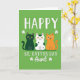 This card shows three stylized cats lined up across the lower center on a bright lime-green background, each with round eyes and small smiles that make them look like friendly companions. On the left is a deep emerald-green cat with yellow eyes, beside a white cat marked with irregular dark-green spots, and on the right a warm orange cat that seems to lean into the group’s cozy togetherness 💚. White shamrocks drift around them like confetti, adding a St. Patrick’s Day touch without crowding the scene ☘️. Near the top, the word “HAPPY” appears in large white letters, spaced clearly so it stands out right away. Beneath the cats, the phrase “ST. CATTYS DAY AUNT” is written in a looser, curving style in white, turning the greeting into a cat-themed pun. The flat, even coloring keeps the shapes simple and crisp, with greens, white, and orange forming the main palette. Small white shamrocks are scattered across the lime-green field, framing the trio from above and around the sides.