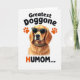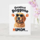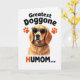 This greeting card features a golden-coated dog facing forward on a white background, with soft fur shading that makes it feel friendly and close. Dark sunglasses with a spotted pattern sit across its eyes, giving it a cool look that pairs nicely with a matching spotted collar, like it dressed up to impress someone it adores ❤️. The dog’s dark nose and fine whisker lines add a gentle, lifelike touch, as if it’s leaning in for attention from its favorite person. Two orange paw prints sit to the left and right of the head, adding a bright accent that frames the face like little signs of affection. At the top, rounded text reads “Greatest Doggone” in deep black, centered above the illustration. Near the bottom, “HUMOM...” appears in bright orange, also centered, with the ellipsis adding a teasing, affectionate pause 🌼. The sunglasses are dark-lensed with a spotted frame, and the two orange paw prints sit evenly on either side of the dog’s head.
