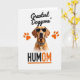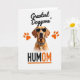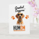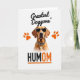 Designed with a head-and-shoulders portrait of a light-furred dog on a white background, the card feels like a stylish snapshot of a loyal companion looking straight at you ❤️. Dark sunglasses cover the eyes, and the lenses carry a small spotted pattern that gives the dog a confident, slightly teasing look, like it’s sharing a private joke with its favorite person. A matching patterned collar sits at the neck with a tiny metallic tag, adding a dressed-up touch that reads like affection in accessory form. Bright orange paw prints sit around the head like a frame, adding warm energy and a friendly, close-bond feel 🌼. Near the top, the phrase “Greatest Doggone’,” appears in black lettering, centered above the portrait. Near the bottom, “HUMOM” is set in thick black letters with an orange section that’s underlined in orange for emphasis. The overall palette stays mostly white and black with pops of orange and soft brown fur, and the orange paw prints stand out clearly around the dog’s face.
