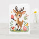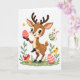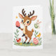 This card features a small deer-like creature standing upright at the center, with soft brown fur, tiny white spots, and gentle little antlers, looking down with rosy cheeks as it offers a pink-and-cream striped egg like a sweet gesture between friends. A bright white background keeps the scene airy, letting the soft colors feel calm and close. In the upper right, a long-eared bunny 🐇 springs into the air with a green-and-cream striped egg, as if joining in on the shared moment. Along the bottom edge, a slim strip of light green ground holds a few simple yellow flowers and leafy sprigs that frame the characters without crowding them. Near the main figure’s feet, a small red bird stands close, while a sunny yellow bird perches among the leaves near another decorated egg, adding a cozy, companionable touch. The greeting text sits above the characters in light pink lettering, centered and easy to spot against the white space, with a smaller line in soft gray placed just below it. Smooth lines and soft shading give everything a tender look, from the deer’s wide-set eyes to the glossy stripes on the eggs 🌷. The lower border shows pale green grass dotted with tiny yellow blooms and a few rounded leaves.