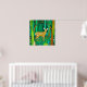 Poster in a stylized illustration of a cute, spotted fawn in a fairytale forest setting, surrounded by trees and plants, in shades of brown and green