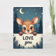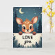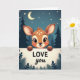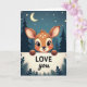 On the front of the card, a cute cartoon fawn peeks out from behind a bright white banner, looking right at you with big brown eyes, long lashes, rosy cheeks, and a small, shy smile 🥰. Its warm brown face is dotted with little white spots, which makes it feel extra sweet and gentle. Across the center banner, the words “LOVE you” are printed, with “LOVE” in a smooth, flowing letter style and “you” in a simple, easy-to-read style. Behind the fawn is a quiet forest at twilight, with a deep indigo sky filled with tiny stars and a thin crescent moon. Dark evergreen trees stand in the background as soft silhouettes, and darker plants along the bottom help frame the message. The cool night colors make the fawn and the white banner stand out, so your message feels clear and heartfelt ❤️. It’s a caring card to give when you want someone to feel noticed, liked, and warmly held in your thoughts.