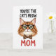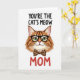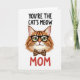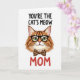 This card features an upright, human-like cat portrait centered on a white background, with plush fur shaded in warm ginger, russet brown, and creamy tones. The cat’s emerald green eyes peer through black-rimmed glasses, and its pink nose and slight smile suggest a friendly, affectionate bond ❤️. Beneath its chin sits a bow tie with a spotted animal-print pattern, adding a dressed-up look that feels like a sweet nod to someone special. The lighting is even and bright, keeping the focus on the cat’s face and the cozy color details. Near the top, the phrase “YOU’RE THE CAT’S MEOW” appears in uppercase black letters, spaced neatly above the illustration. Near the bottom, “MOM” is set in large, deep warm red letters, grounding the layout with a loving emphasis 🌼. The bow tie’s spots alternate in dark and light tones, standing out crisply against the pale background.