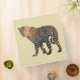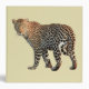 A spotted leopard with beautiful markings. Interesting spotted pattern and soft golden fur. Staring back with a piercing gaze. Set on a light tan background.