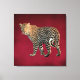 A spotted leopard with beautiful markings. Interesting spotted pattern and soft golden fur. Staring back with a piercing gaze. Set on a regal red background.