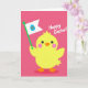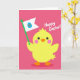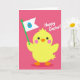 This design shows a rounded baby bird in canary-yellow standing front and center, with big black eyes that seem to gaze sweetly at the viewer and a tiny orange beak. Soft pink blush circles on its cheeks add a tender, friendly look, like it’s shyly greeting someone special 🌷. The bird balances on small orange feet and lifts a small white pennant flag with its left wing, as if offering a cute little sign to a friend. On the flag, a blue oval sits in the middle with four orange dots around it, adding a simple seasonal accent. A solid magenta background fills the whole space, making the yellow bird stand out strongly. In the upper right corner, the words “Happy Easter!” appear in white, in a loose handwritten style, floating clearly against the magenta. The overall illustration uses flat shapes and smooth edges, keeping the focus on the bird’s gentle expression and the small flag detail 🐰. The “Happy Easter!” text stays near the top right while the bird and its flag occupy the center, with plenty of magenta space around them.