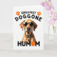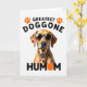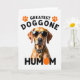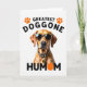 This greeting card centers on a short-haired dog in warm tawny shades against a white background, wearing dark sunglasses and a matching collar with a spotted pattern. The dog faces forward with a steady, affectionate look that reads like a loyal “we’re in this together” bond ❤️. At the top, black all-caps text reads “GREATEST DOGGONE,” with two orange paw-print icons placed on either side for balance. Near the bottom, the word “HUMOM” appears in black, and the “O” is replaced by a bright orange circle that echoes the paw prints. The layout feels modern and tidy, with lots of open space that keeps the focus on the dog’s face and accessories. The warm coat color and orange accents add a sunny touch 🌼 without crowding the design. The sunglasses show subtle reflections, and the orange circle sits neatly within the lower word line.
