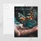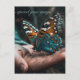 Celebrate a new beginning or honor a beautiful life with this Butterfly in Hand customizable postcard. The design features a stunningly detailed butterfly resting on a hand, captured in vibrant teal and warm copper tones against a soft, ethereal background.