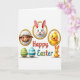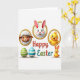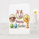 Designed with a bright spring look, this card features three cute animal portraits near the top on a plain white background, each set inside a gold oval frame. In the middle sits a fluffy white bunny with pink-lined ears and a gentle smile 🐰, gazing forward as if posing for a sweet photo. To the left, a soft, woolly lamb with rosy cheeks leans slightly inward, and to the right, a sunny yellow chick with tiny head tufts tilts toward the center, giving the trio a friendly, close-knit feel. Below them, the words “Happy Easter” appear centered in large, multi-colored letters, standing out clearly against the white space. Near the lower area, two striped eggs add extra color—one with green and white bands and the other with blue and white bands—placed like small decorations on display 🌷. Off to the right, a small golden bunny stands in a full-body pose with an expressive stance and a tiny red tail. Soft, even lighting keeps the figures looking gently rounded, with the gold frames and golden bunny catching a light sheen. The layout stays airy and balanced, with the gold ovals at the top and the striped eggs and golden bunny arranged below.