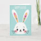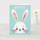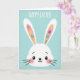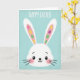 This card shows a stylized white bunny face centered on a muted aqua background, with long upright ears that frame the head like a gentle embrace 🐰. The bunny has large black eyes, a tiny black nose, a small curved mouth, and rosy cheeks that suggest a shy, affectionate look, as if it’s posing for someone it likes. Fine black whiskers fan out from both sides, adding a soft, friendly touch. Inside each ear, a pale pink panel is sprinkled with small egg-shaped dots in pastel yellow, green, purple, and pink, like little gifts tucked close. Near the top, a short Easter greeting sits in rounded white lettering, spaced evenly above the ears so it feels light and airy 🌷. The background has a faint speckled texture that makes the bunny stand out without harsh contrast. The inner-ear dots are scattered in a loose pattern, with a few brighter pieces near the middle of each ear.