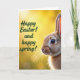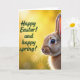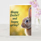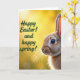 This design shows a soft-furred rabbit along the right edge of the image, shown in profile with light brown and cream fur that looks gently brushed by sunlight 🐇. Its dark, glossy eye catches a tiny reflection, giving it a tender, attentive look as if it’s quietly watching someone just out of view. The background fades into warm golden yellows and oranges, with blurred circles of light that suggest a sunny meadow scene at golden hour. Fine whiskers glow where the light hits them, adding a delicate, affectionate touch to the rabbit’s face. A partially visible ear shows a muted pink interior, bringing a natural softness to the portrait. On the left side, a short Easter message appears in dark green cursive lettering, sitting against the bright backdrop so it’s easy to notice 🌷. The text is placed with plenty of open space around it, balancing the rabbit on the opposite side while the background stays softly out of focus with sunlit bokeh.