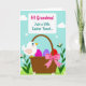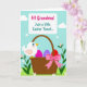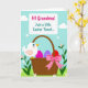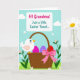 Designed with a soft spring-day look, the scene centers on a woven brown basket brimming with three decorated eggs in magenta, lavender, and deep red, each marked with stripes or speckles. A large pink bow drapes across the basket’s front, like a sweet little gift shared between close friends 🌷. Sitting on the curved handle is a round white bird with bright blue eyes, a tiny yellow beak, and a peach blush on its chest and cheeks, giving it a gentle, affectionate expression. Behind it, a green hillside rolls into a pale blue sky with puffy white clouds, keeping the setting light and airy 🐰. Small white daisies with golden centers appear in the grass and echo upward near the sky, tying the whole scene together. Thin green sprigs with small pink buds rise along the sides, subtly framing the basket like a quiet embrace. Near the top, a soft-edged rectangular panel holds the greeting text in two contrasting type styles, with the main line in a darker tone and smaller wording beneath in a lighter shade. The basket sits slightly below center with the pink bow facing forward, while the text panel floats above against the sky.