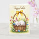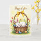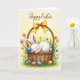 This card shows a detailed wicker basket with an arched handle, wrapped with a shiny golden ribbon tied into a neat bow. Curled inside, a chubby white bunny 🐰 sleeps with eyes closed, a tiny pink blush on its cheeks, giving the scene a tender, cared-for feel. Smooth oval eggs in sky blue, soft coral, and golden orange tuck around the bunny and peek over the basket’s rim, like little surprises placed by a thoughtful friend. The basket sits in thick green grass dotted with white daisy-like blooms, plus tulips in yellow, orange, and gentle pink, with small blue wildflowers sprinkled between 🌷. A warm golden light fades in from the background, softening edges and making the ribbon and eggs catch the eye. Near the top, a flowing line of dark lettering arches overhead, centered above the basket and easy to spot against the light backdrop. Fine texture shows in the basket’s weave, the bunny’s fluffy fur, and the silky flower petals, with the golden bow gleaming at the curve of the handle.