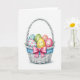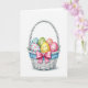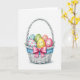 The front design shows a white wicker basket centered on a soft white background, with woven texture you can almost feel and a twisted handle arching overhead. A blue-and-white checked band wraps around the rim, adding a crisp contrast to the pale setting. Inside sit five decorated eggs in gentle pastel blues, greens, yellows, and pinks, arranged close together like a small group leaning in for a friendly moment 🐰. Each egg carries tiny floral patterns and leafy sprigs, with some showing little pink blossoms and others trailing green vines that curl toward their neighbors. A full pink bow spreads across the front of the basket, its loops and tails overlapping the wicker in a way that feels sweet and affectionate 🌷. Small bits of fresh green foliage peek between the eggs, softening the arrangement and adding a garden-fresh touch. Near the top, simple Easter text appears in a light pastel color, centered and spaced to match the airy background. The bow’s satin-like highlights and the basket’s fine weave stand out against the pale backdrop.
