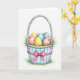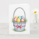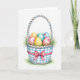 This card shows a spring basket centered on a wide white background, giving the scene lots of airy space around it 🌷. The basket has a blue-and-white gingham pattern, wrapped with a soft pink ribbon tied into a neat bow that feels like a gentle gift between close friends 🐰. A braided handle in pale blue and light beige arches over the top, adding a cozy, touchable look. Inside, six glossy eggs rest in bright green grass, nestled close together like they were arranged with care for someone special. The eggs include sunny yellow, rosy pink, turquoise, and warm orange, each decorated with tiny flowers or fine stripes that suggest a sweet, shared tradition. Near the top of the design, “Happy Easter” appears in a light pink, simple lettering that stands out softly against the white space. Small white-and-pink blossoms dot a couple of the eggs, and the bow’s tails curl slightly along the basket’s front.