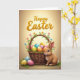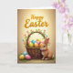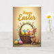 This design shows a softly lit spring scene with a woven rustic basket at the center, brimming with smooth decorated eggs in blue, pink, yellow, and orange. Nestled among them, a tiny yellow chick peeks out as if sharing a secret with the nearby long-eared rabbit 🐰. The rabbit’s reddish-brown fur looks plush, and its gentle, curious gaze leans toward the basket in a way that suggests quiet friendship. Behind them, a warm golden-beige gradient background glows with light that falls from above, giving the setting a calm, cozy look. Green leaves and small pastel blossoms curl around the basket handle, adding a tender garden touch 🌷. Across the top, a seasonal greeting appears in embossed gold lettering, centered and easy to spot against the light background. On the grassy ground, three extra decorated eggs rest near the rabbit’s white tail and neatly detailed paws.