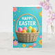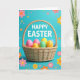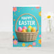 This design shows a wicker basket centered on the card, filled with smooth egg-shaped treats in pink, yellow, green, and sky blue, like a sweet little gift meant to be shared 🐰. The woven texture of the basket adds a cozy, down-to-earth touch, and the shiny eggs catch the light as if they were just placed there for someone special. Behind it all is a bright azure background that keeps the scene airy and open, like a clear spring morning. Scattered across the blue are small flower shapes in soft pinks, oranges, and yellows, mixed with tiny stars and pale blue polka dots that drift around like confetti 🌷. Near the top, a seasonal greeting is set in large white letters, standing out clearly against the blue. The layout leaves the basket as the main focus while the floating decorations frame it, giving the whole design a gentle, friendly energy, and the text sits centered above the basket. Tiny yellow flowers and little star shapes dot the corners, with light blue polka dots sprinkled between them.
