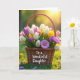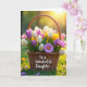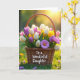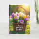 This greeting card features a rustic wicker basket centered in the scene, overflowing with spring flowers against a bright, glowing backdrop. The basket’s detailed weave and arched handle feel like an inviting gesture, as if it’s being offered to someone special ❤️. A lush mix of tulips opens in creamy white, soft lavender, sunny yellow, and tender pink, arranged closely like friends leaning in for a photo. Purple daisy-like blooms with golden centers add a cheerful contrast, tucked among deep green leaves that give the bouquet extra depth 🌼. Warm golden-hour light streams from the upper right, backlighting the petals so they look softly translucent and almost luminous. The background stays gently out of focus with sun-dappled greens, suggesting a calm garden setting without pulling attention from the flowers. Near the top, a short Mother’s Day greeting appears in a simple, dark font, while a smaller line of text sits below in a lighter color. The wicker handle curves above the bouquet, catching a thin rim of light along its edge.